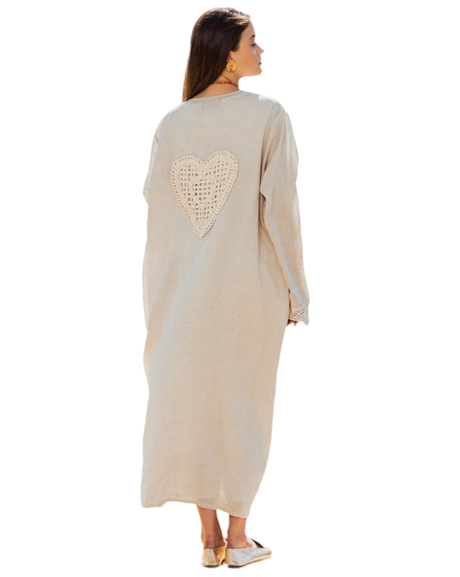 Discover the timeless elegance of Bleeding Hearts, a women's beige pure linen kaftan that transcends seasons and trends. Crafted with the finest linen, this beige linen kaftan envelops you in luxurious comfort and effortless style.